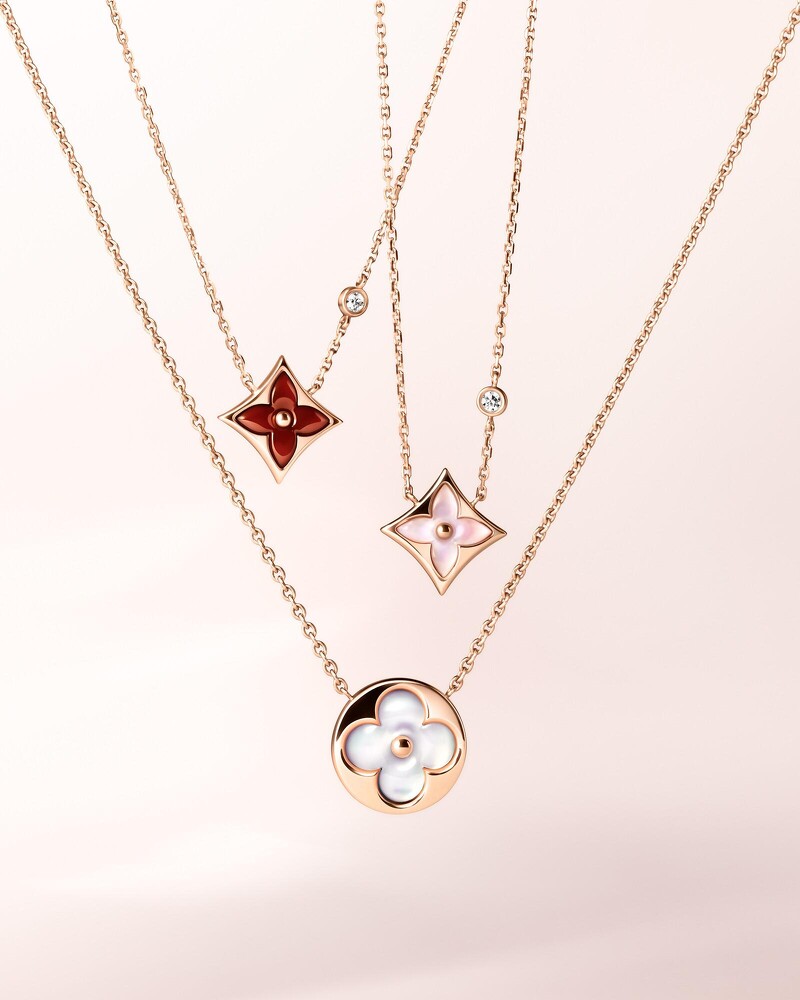 同样以Monogram花朵图案为题的Color Blossom 系列在2025年初春推出彩色宝石新款,包括白色珍珠母贝、粉红色珍珠母贝、红玉髓、绿色孔雀石、黑色缟玛瑙及海蓝色天河石(前四种搭配18K玫瑰金,后两种搭配18K黄金),以多元形状、尺寸的变奏,带来27件新成员——从项鍊、 吊坠、耳环到戒指到手鍊兼备,以明媚色彩和百搭性,从细节日常穿搭添加活力风采。